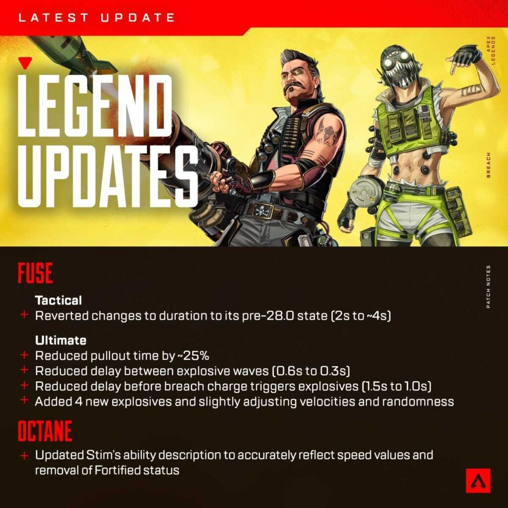 Fuseโs Tactical ability has had its duration reverted to its pre Season 28 state, increasing the duration from roughly two seconds back to around four seconds. This change allows Fuse to hold space longer and pressure enemies more effectively during fights.